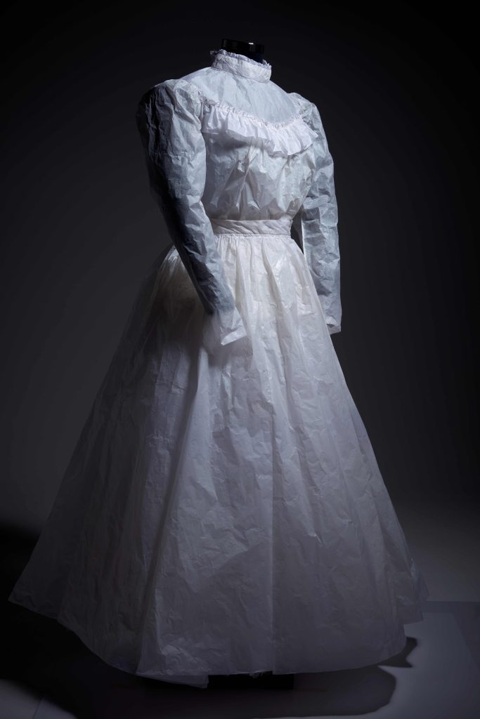 The garments’ shifting styles, the contradictory fragility of tissue paper as garment, and the act of printing the fur’s texture – all work together to shape meaning. As printed fur, we are offered an impression only, an echo. In southeast Australian Aboriginal cultures, possum skin cloaks are identity-bearing garments, surfaces for story and providers of literal warmth. These works remove us from the tactile and cultural qualities of possum skin itself and invite us to consider what happens when cultural knowledge is transmuted through context, through the passage of time or through disrupted/broken family transfer.